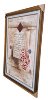 The vintage parchment background, adorned with a geometric red diamond and intricate shamsas, creates a piece that feels both historically significant and spiritually alive.