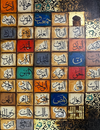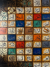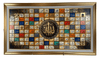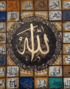 The composition anchors the eye with a prominent central medallion featuring the name "Allah" in bold gold script. Surrounding this core are individual squares, each hand-painted with a specific name, interspersed with jewel-toned accents of blue, orange, red, and green, resembling an ancient tile mosaic.