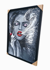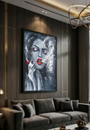 Make a bold statement with "The Enigmatic Muse," a striking piece of modern art. This painting features a woman in monochromatic grey tones, highlighted by vibrant red lips and shimmering pink eyeshadow. She exhales a swirl of artistic white smoke, adding abstract mystery to the composition.
