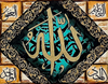 At the heart of the grid lies a diamond-shaped centerpiece featuring the name "Allah" in bold, raised calligraphy against a dark textured background, surrounded by jewel-toned blocks of teal, amber, cobalt, and crimson.