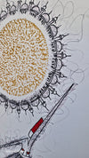 Capture the essence of spiritual transcendence with "The Eternal Dance." This unique artwork depicts two Whirling Dervishes immersed in their sacred Sema dance, rendered in an expressive, ink-sketch style. Above them shines a magnificent golden sun, intricately detailed and surrounded by a halo of mosque silhouettes, symbolizing the light of faith and the community.