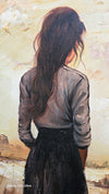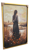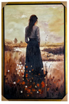 Immerse yourself in quiet contemplation with "The Silent Horizon." This evocative painting features a lone woman in a field of wild grasses, using rich impasto brushstrokes to bring the scene to life with pops of red and white flowers.