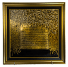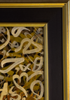 This artwork features a stunning composition where the central text is written in clear, legible script, surrounded by a mesmerizing border of abstract, interlacing Arabic calligraphy. The entire piece is rendered in radiant gold leaf against a deep, textured black background.